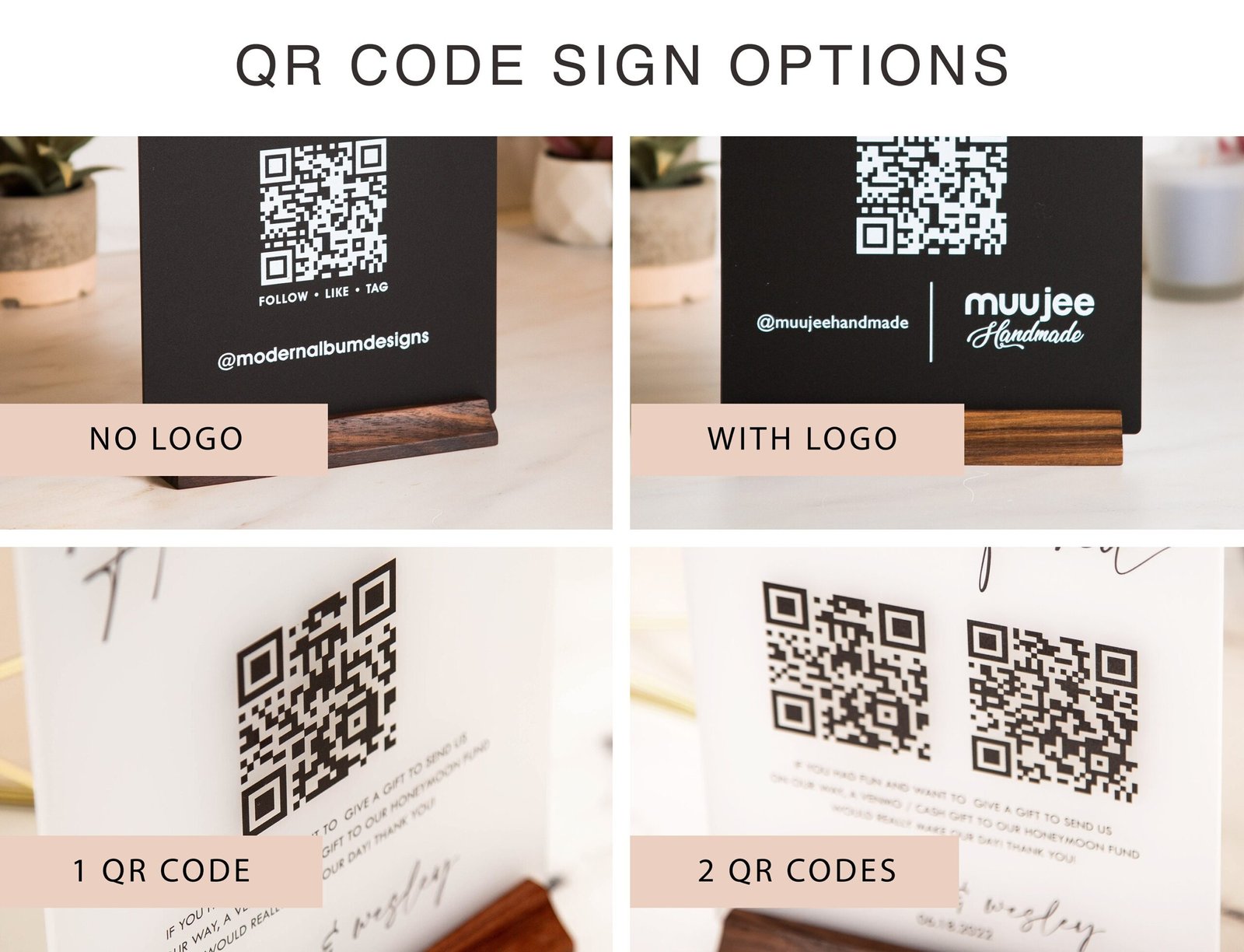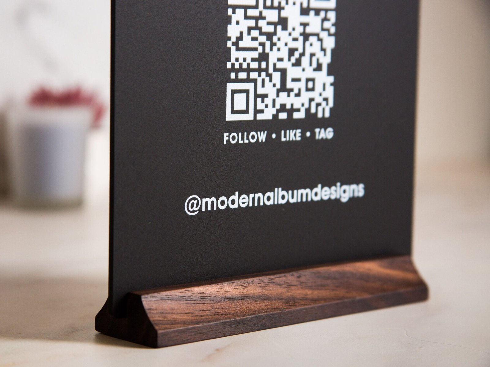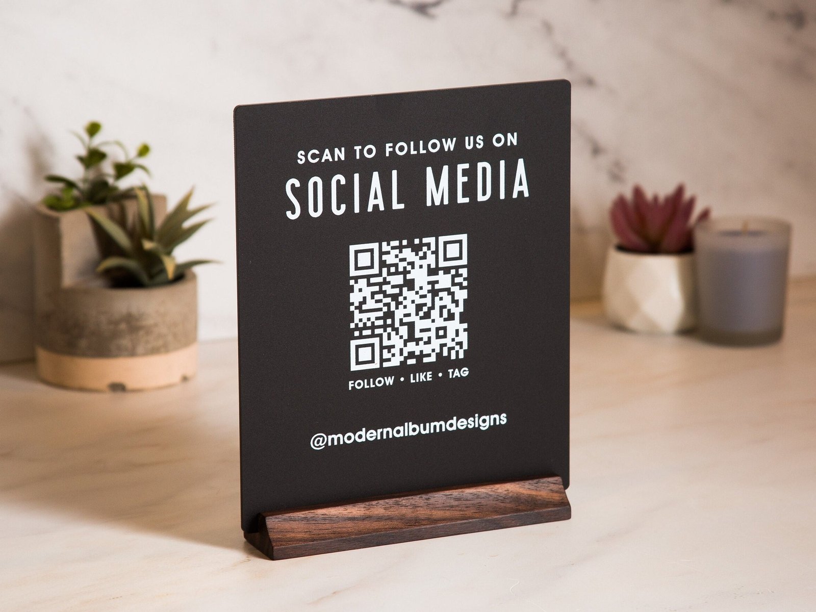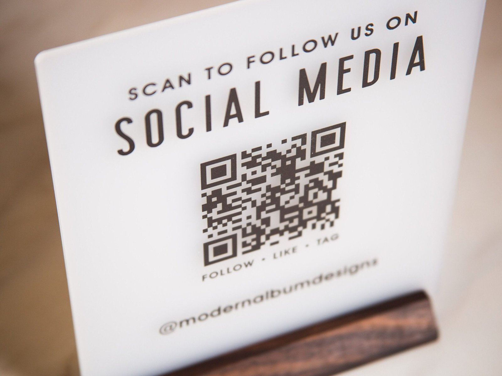 • Modern and Stylish: Elevate your business aesthetic with a modern QR Code Social Media Sign featuring a sleek design and a natural wood stand for a sophisticated touch.